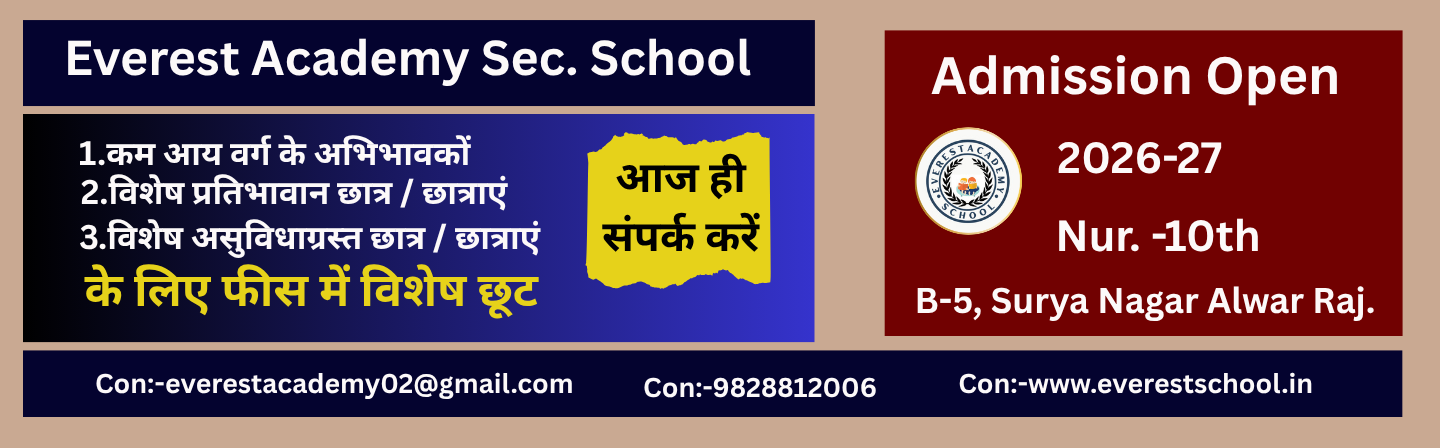 It gives me immense pleasure to share that Everest Academy Secondary School, Surya Nagar, Alwar has been serving the noble cause of education with dedication and commitment for the past 25 years. Over this remarkable journey, our institution has earned a reputation for providing quality education while fostering a nurturing and disciplined environment for students. We firmly believe that education is not limited to textbooks alone; rather, it is a continuous process of learning that shapes character, builds confidence, and prepares individuals to face real-life challenges.